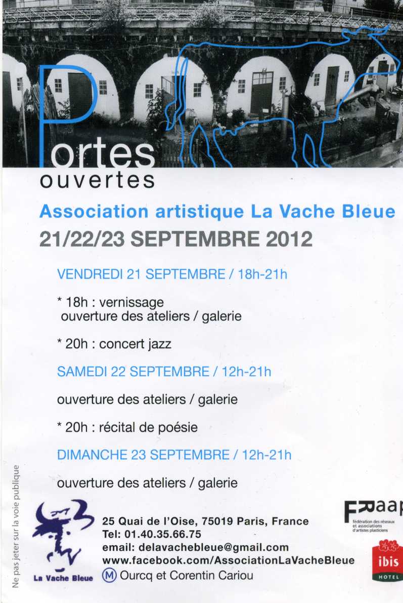 // Et pour fêter cela je vous invite ce week-end, 21 – 22 – 23 septembre prochain, aux Portes Ouvertes des ateliers de l’Association La Vache Bleue, au 25 quai de l’Oise à Paris… où j’ai installé mes quartiers depuis juin dernier. Vous trouverez ci-dessous le programme qu’on vous a concocté.
